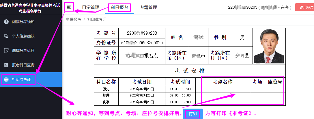 打印《準(zhǔn)考證》還沒到時間,耐心等通知,等到考試前一星期,考點、考場、座位號安排好后,方可打印《準(zhǔn)考證》:
