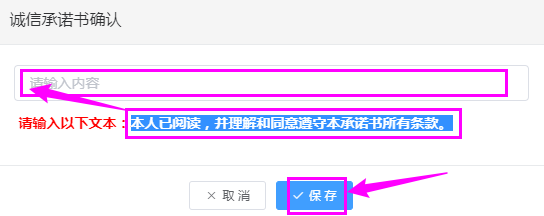 接下來是誠信承諾書確認,填寫以下文本(標(biāo)點符號都不能錯),然后點擊【保存】按鈕: