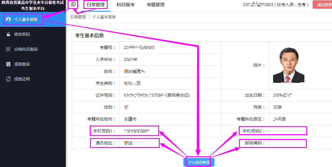 個人信息只能修改4項,其中:手機號碼1、通信地址是必填項,必須填寫;手機號碼2、郵政編排是選填項,不填也可: